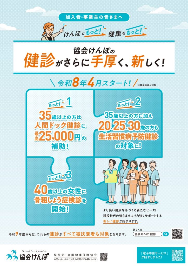 令和8年度4月1日より、協会けんぽご加入の方は生活習慣病健診だけでなく、人間ドックの一部金額補助が開始されます。